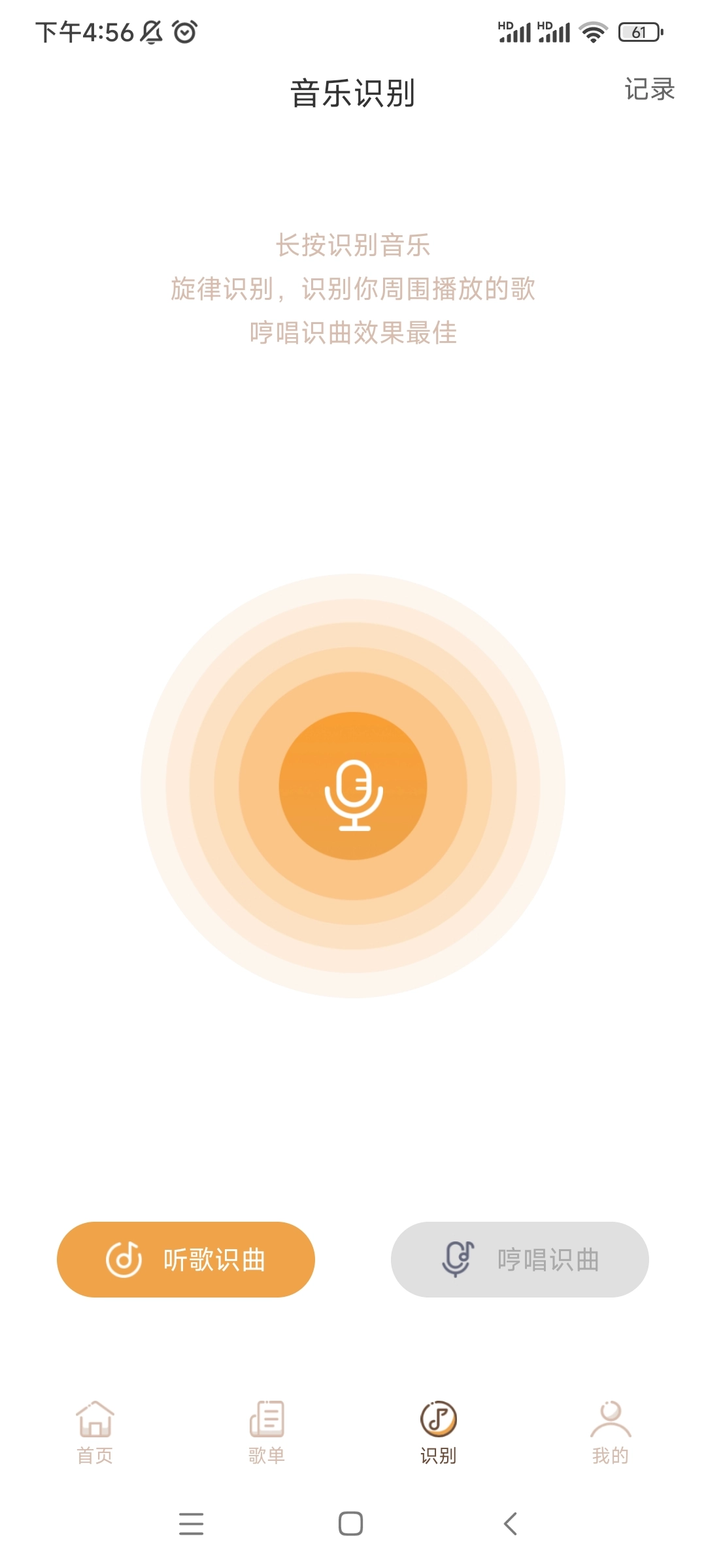4、要是碰到不知名的歌曲,使用识别功能,通过哼唱或者录音就能找到对应的歌名。