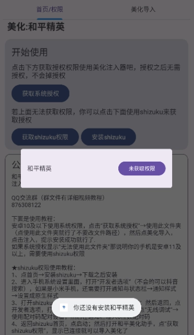 - 开启Shizuku服务,随后返回美化助手并点击“获取权限”。