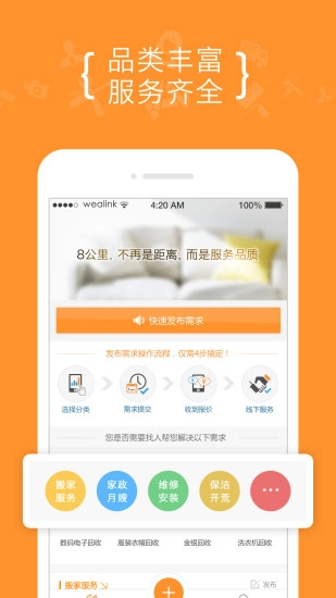2、“8公里”是一款供用户发布需求的专属软件。用户仅需简单填写几个问题,“8公里”便能在短时间内为其匹配到周边合适的服务商。之后,用户可通过比价、对比服务质量等方式,挑选出合适的服务商。
