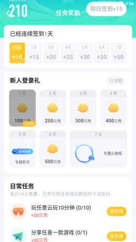 2、贝壳兑换。贝壳能够用来兑换游戏时长,获取贝壳的途径有签到、新人登录礼、日常任务以及成长任务这几种。
