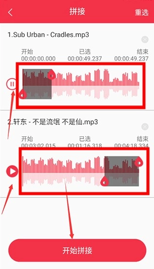 - 为各段音频设定起点和终点,借助左侧的播放键能够预览片段效果。