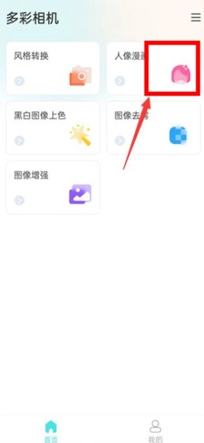 首页展示了多种功能,包括风格转换、人物漫画化、图像增强等。根据需求选择对应功能。