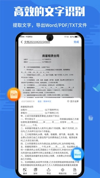 该软件具备强大的扫描识别能力,无论是文件、图片、书籍,还是名片等,都能精准识别,并从中提取文字内容。其智能剪裁功能十分实用,能够去除杂乱的背景,用户可自由截取文字或特定区域,而且识别结果会自动分段,极大地方便了用户后续的编辑与使用。