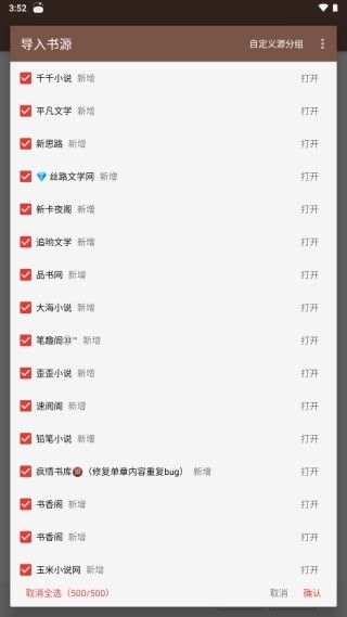 5、软件会自动导入该网站所收录的书源,全部选中后,点击右下角的“确认”按钮即可。