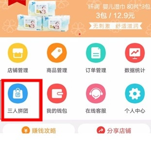 在首页的焦点图里,找到并点击“3人拼团”这几个字,随后会进入拼团产品的页面,在此页面中,点击“开团”按钮即可发起拼团。