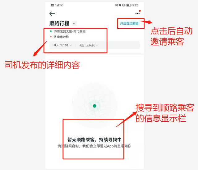 5.发布行程,系统会根据司机的出发地和目的地自动匹配顺路的乘客,可以主动和乘客联系,约定时间接客人出发;(如图5)