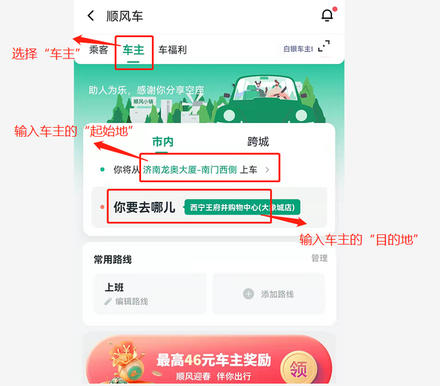 2.页面跳转后选择“车主”身份-然后分别输入车主发车的“起始地”和最终到达的“目的地”;(如图2)