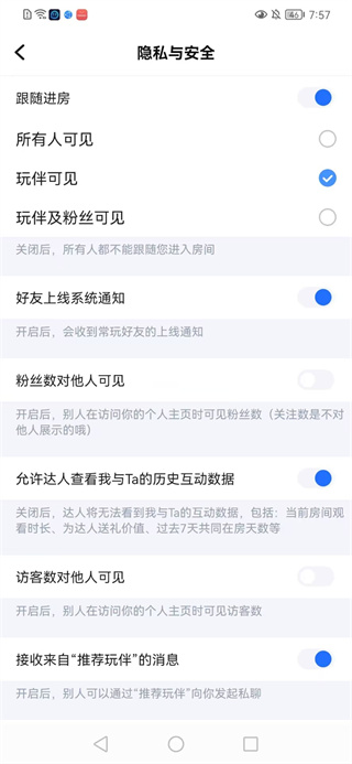 4.进入到隐私与安全,可以设置跟随进房,你可以勾选所有人可见、玩伴可见或者玩伴及粉丝可见。