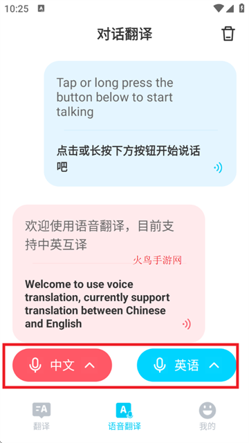 3、语音翻译功能:若需将中文翻译为英文,长按说话按钮并说中文,系统会自动将所说内容转写成英文。