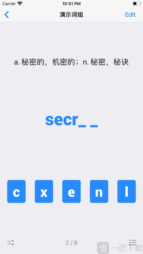 2. 从五张卡片中挑选出正确的字母,拼写出完整的单词,此外也支持通过键盘进行输入。