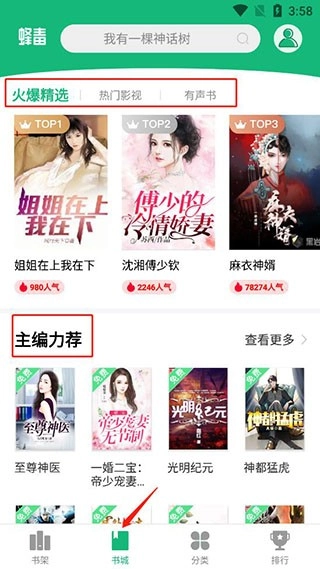 1、想要发现好书就可以来书城中,这里有火爆精选、热门影视、有声书等海量类型的小说推荐,书荒就可以来这里;