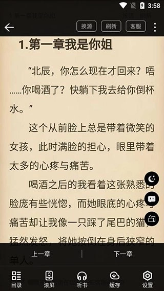 4、然后就可以进入阅读,呼出菜单可以查看目录、听书、缓存以及其他设置;