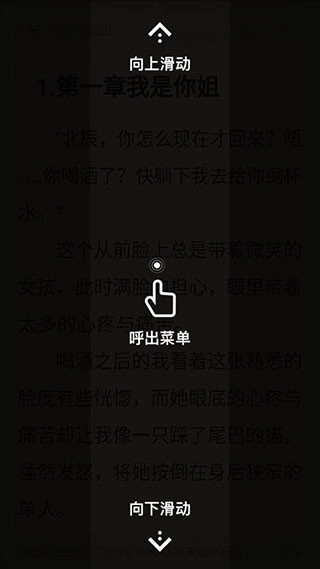 3、第一次使用的话会贴心的给你观看提示,可以向上滑动、向下滑动以及呼出菜单;