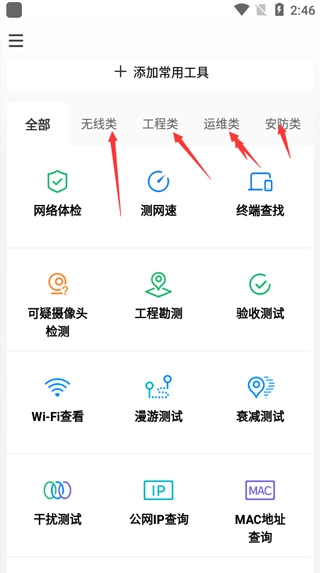 3、点击无线类,具备网络体验、测网速、终端查找、wifi查看、漫游测试等功能。