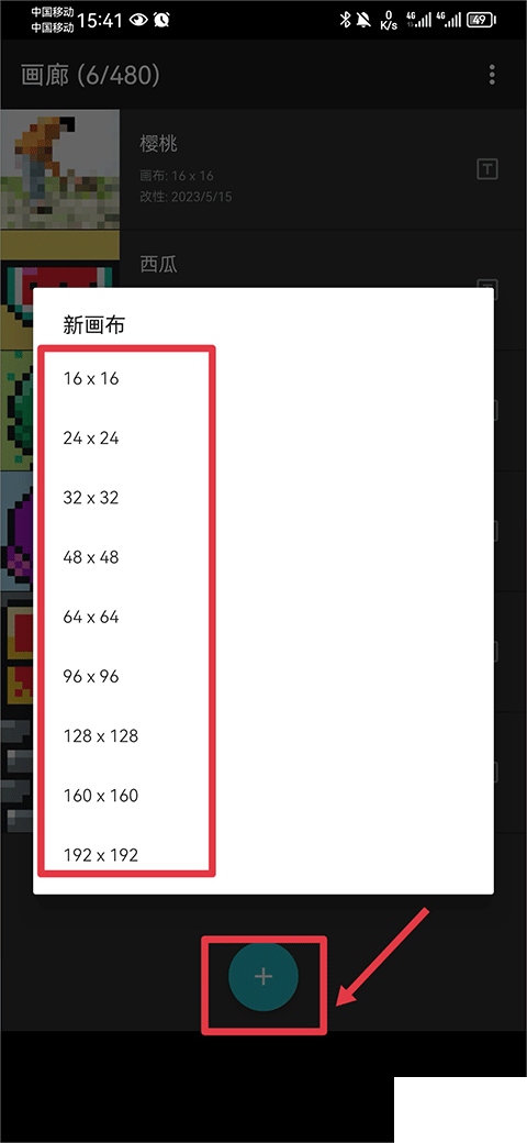 1、应用开启操作:启动八位元画家应用程序,点击界面下方的蓝色“+”号按钮,选择所需的画布尺寸。