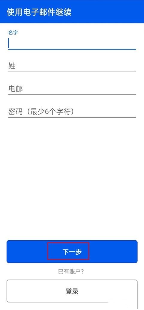 3、填入您的姓名、电子邮件及密码等信息,接着点击下一步。