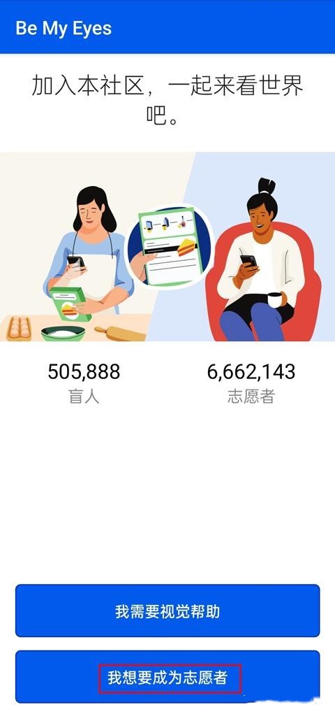 1. 开启be my eyes软件,若你希望成为一名志愿者,那么点击下方的“我想成为志愿者”选项。