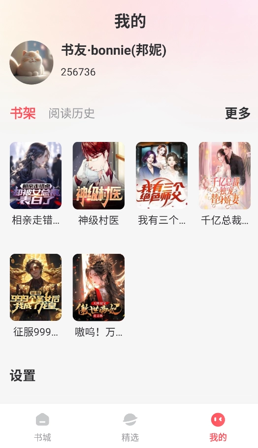 6、轻点屏幕右下角的“我的”选项,即可查看书架、阅读历史等相关内容。