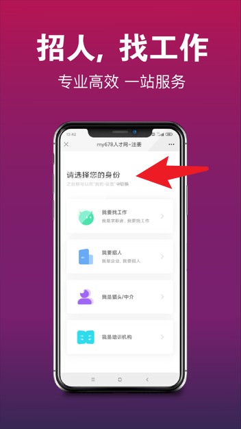1. 进入之后,您可选择自身身份,例如求职者、招聘者或者中介等,系统将匹配相应功能。