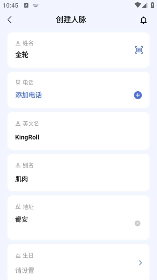 3、接着在人脉创建页面添加各类信息即可,还支持扫描名牌,极为便捷。