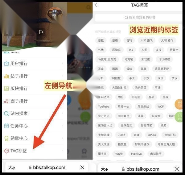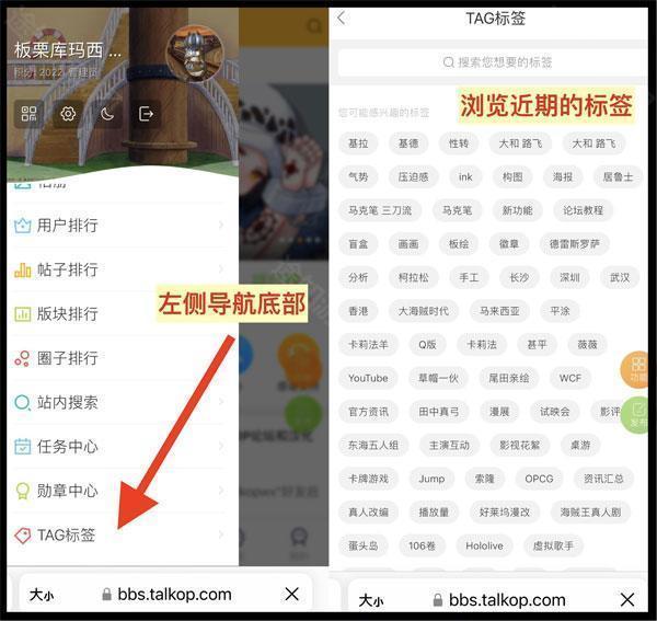 在首页左侧导航页,将页面划至底部,点击“TAG标签”,即可浏览近期的标签。
