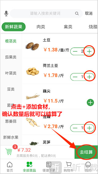2.选择所需食材并设置数量,点击“+”按钮,确认数量后点击“去结算”。