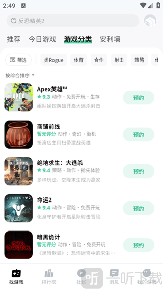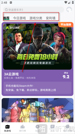 2. 来到首页,可借助今日推荐、热门分类等板块对游戏进行筛选,此外,还能进入排行榜,查看热门游戏或者高分游戏。