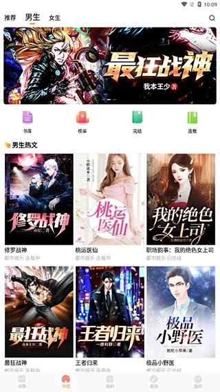 1、在书城中,能看到推荐、男生、女生等相关内容。