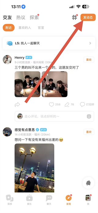 2、在发现页面中,点击右上角的发动态按钮,进入动态编辑页面。