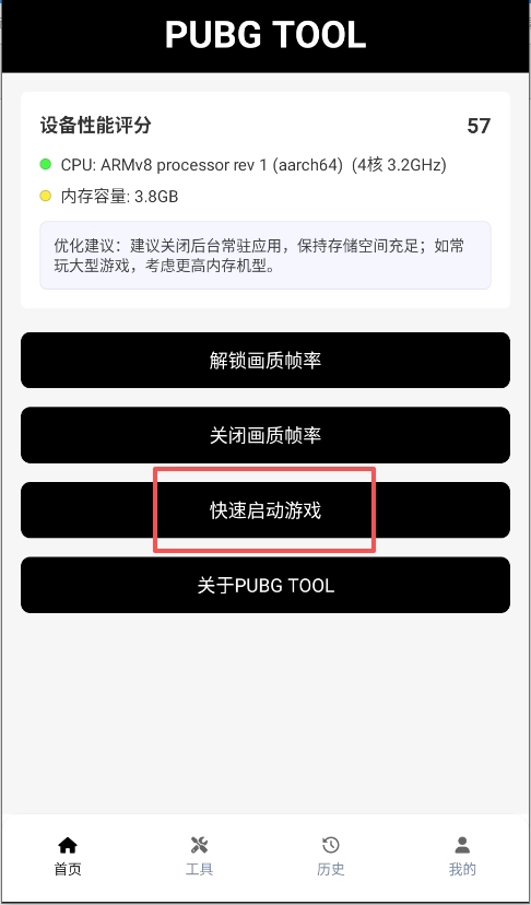 1、手机提前安装好和平精英游戏,下载安装本站提供的pubgtool画质助手,然后打开软件可以查看相关的说明;