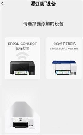 2、点击【暂无设备,前往绑定】,从可选项中挑选要添加的设备,当前仅支持EPSON、小白学习打印机、小白智慧打印II 。