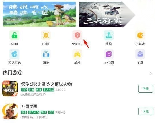 1. 第一步,打开7723游戏盒,游戏位于首页,在导航栏下方能找到免ROOT选项,点击该选项就能进行游戏修改。