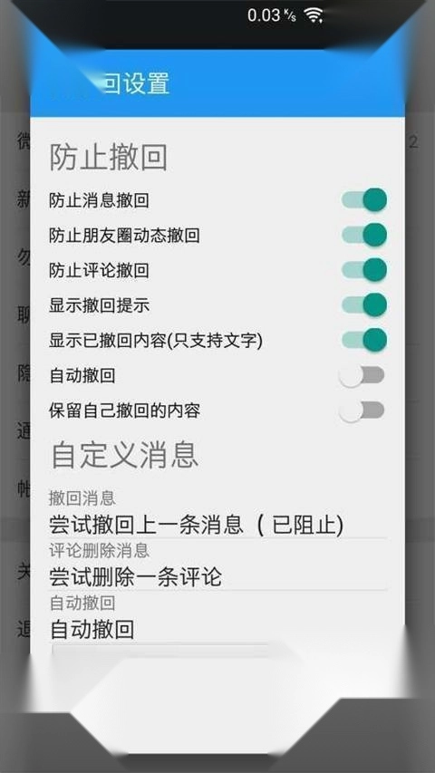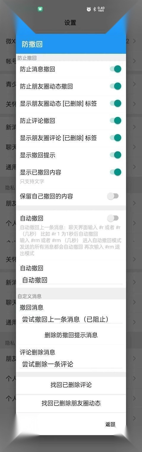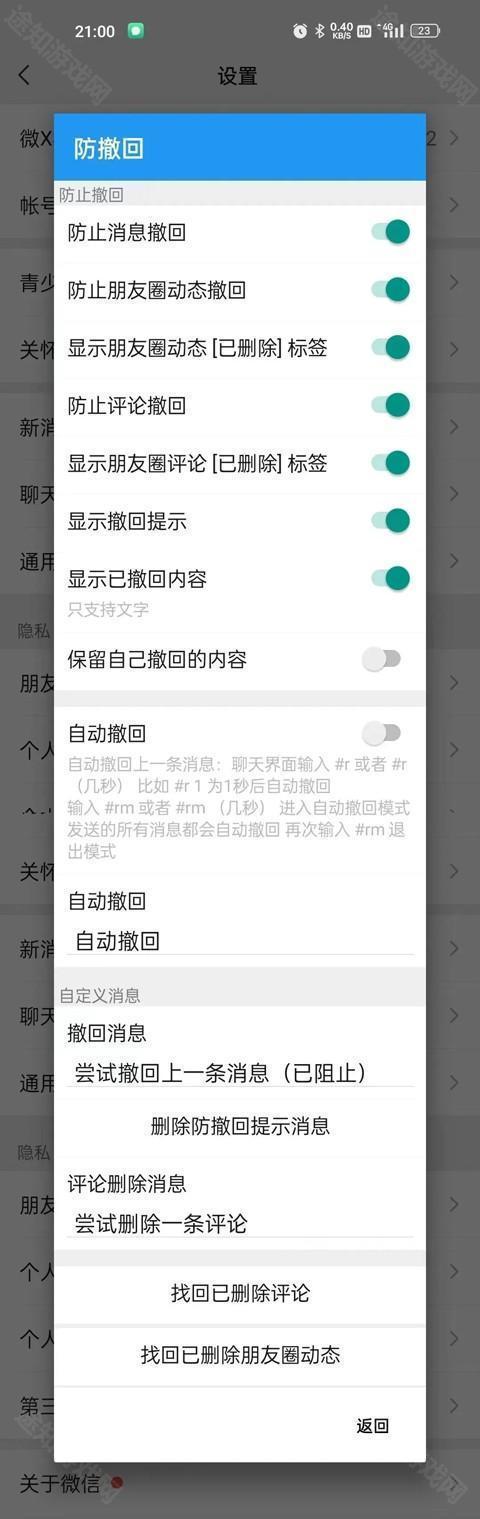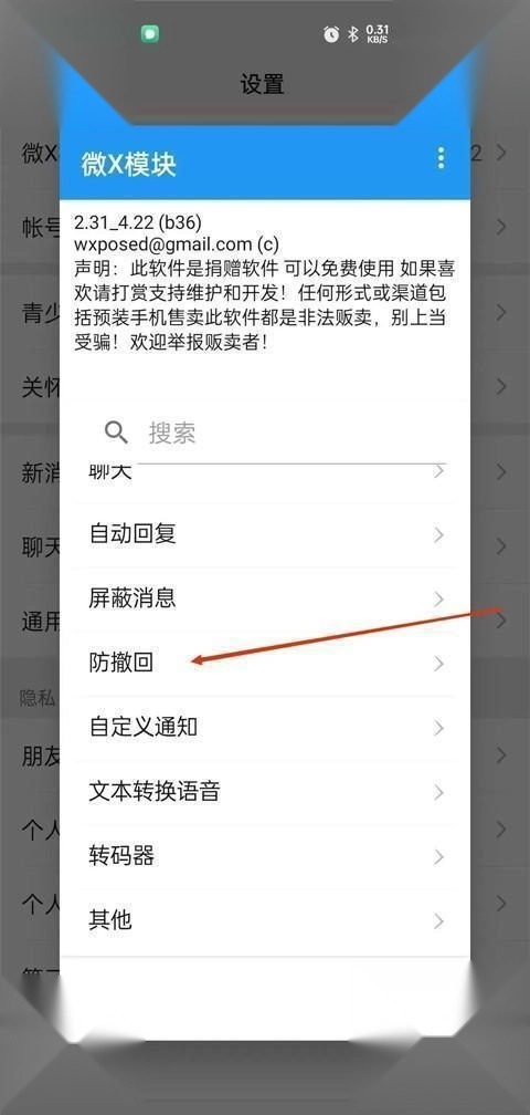 6、在微信设置里,打开微x模块设置,然后向下滑动页面,找到防撤回选项。