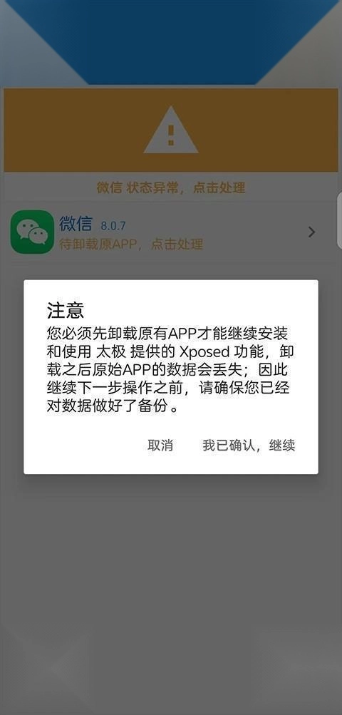 3、若要将应用添加到太极模块,需删除原应用,在此建议您先备份数据。