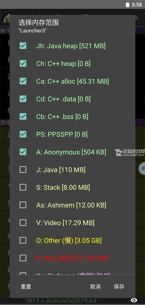 内存范围通常选用默认设置。在使用gg时,一般主要用到A类、Ch类、Ca类以及Jh类内存。后面中括号内,内存越大,就越有可能是该游戏的内存,其中A类内存最为常用。选择的内存范围越多,搜索过程会变得越慢,不过搜索结果会更加精准。