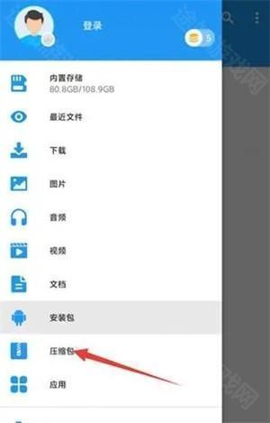 2、轻点左上角的“三个杠”图标,随即进入侧栏,于侧栏所提供的众多选项里,挑选“压缩包”这一选项。