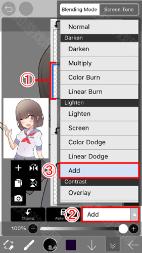 点击“图层1”,让添加的图层变为当前图层。接着点击“添加”,打开步骤2的混合模式菜单。最后在“混合”菜单中选择步骤3进行添加。