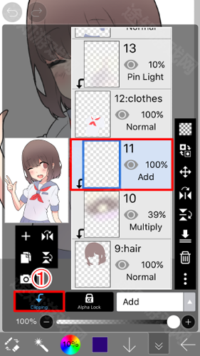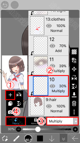同样,在“图层”窗口中点击加号按钮,为阴影添加图层,使其成为当前图层,将③混合模式设为“乘法”,并最终转到步骤四进行剪切操作。此外,把画笔颜色改为黑色。