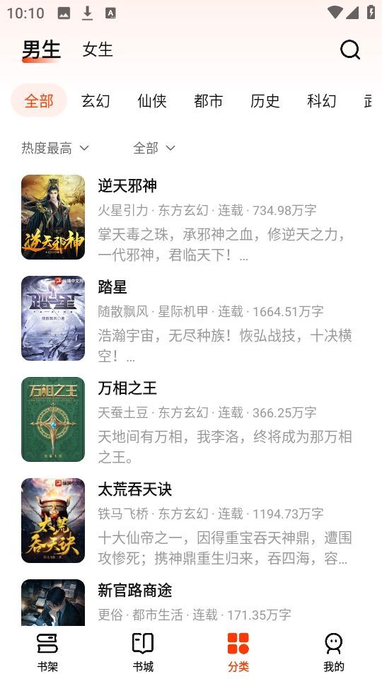 3、接着点击“分类”按钮,便能发现玄幻、仙侠、都市、历史以及科幻等各类题材的小说。