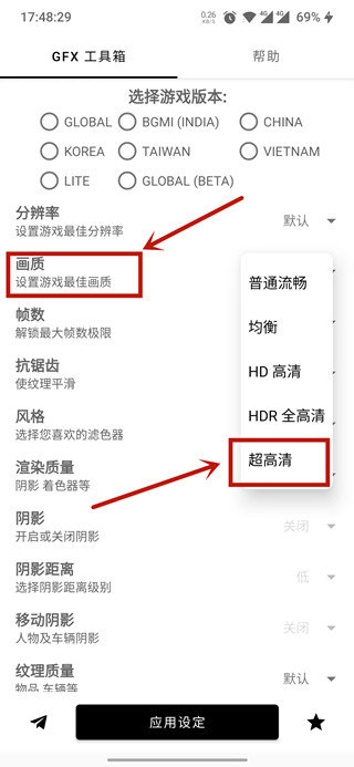 1只有在选择到对应的游戏版本后,修改画质才能生效。