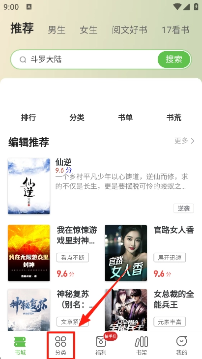 2、在“书城”页面,为用户推荐了大量小说资源。