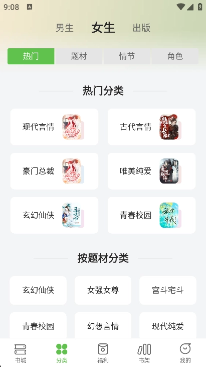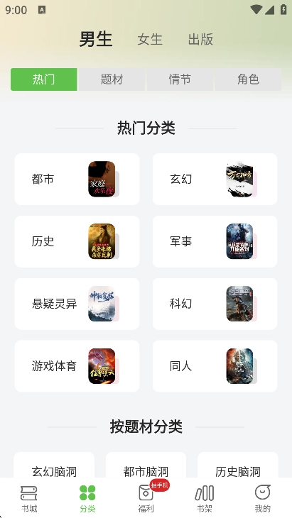 3、在“分类”页面,存在大量小说资源,涵盖言情、科幻以及角色等多种类型。