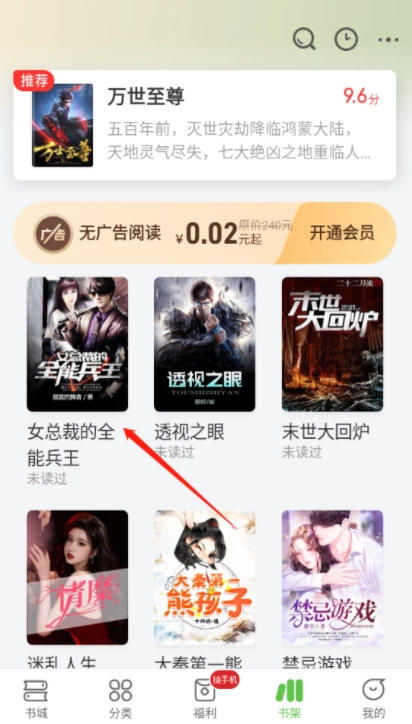3、返回首页,在“书架”里便能看到已加入书架的小说。