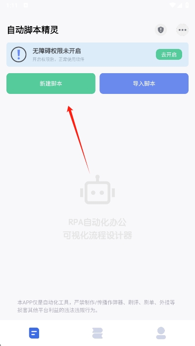 1、若要创建一个自动脚本,需先打开并同意协议,之后方可进入。