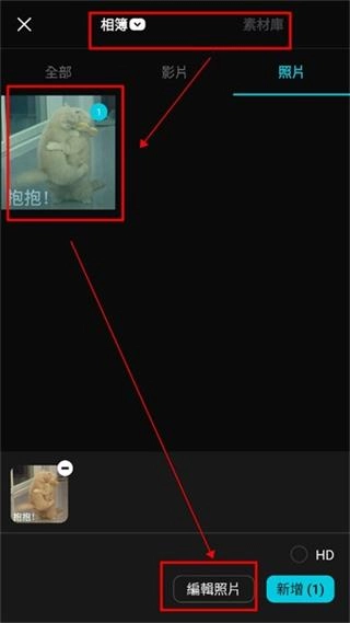 3、能够在本地的“相簿”或者“素材库”中找到要编辑的图像。在此,以本地照片作为示例,挑选出需要处理的素材后,点击“编辑照片”。