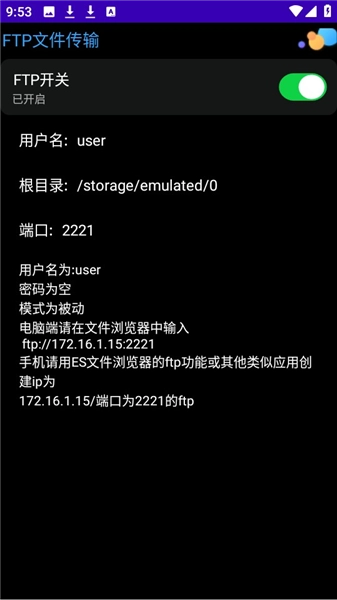 3、接着打开ftp开关,使用前务必先开启WiFi,且两个设备需处于同一WiFi环境中。