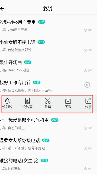 3、点击一首自己喜爱的彩铃,能够对其进行设置铃声、裁剪、分享等操作。