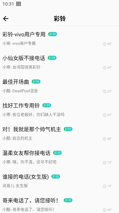 3、每首铃声均展示了时间、播放量以及歌手信息,方便用户进行选择。