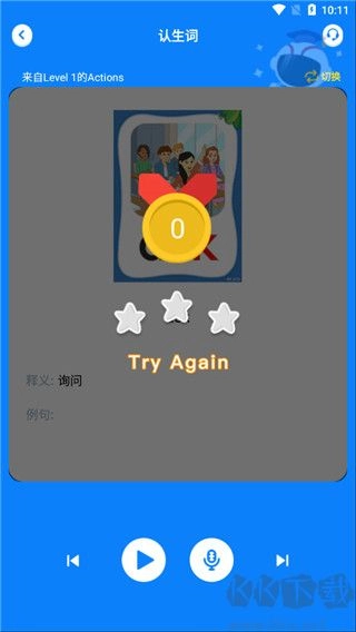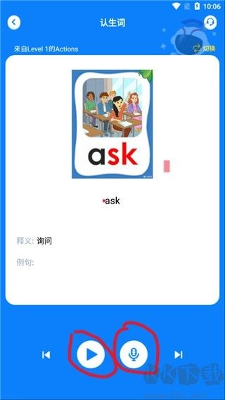 2. 轻点认生词,接着点击下方的播放按键,随后点击麦克风按钮自行朗读,系统会依据你的读音进行打分。