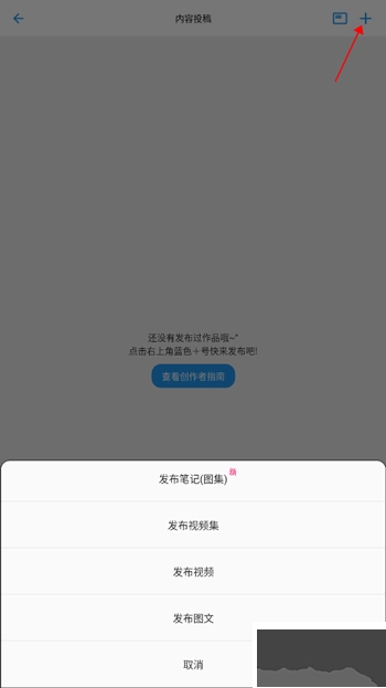 3、进入投稿页面,点击右上角的“+”,选择你想要发布的类型。